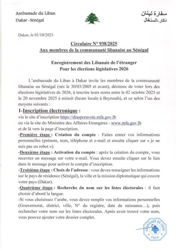 ou via le site web du Ministère des Affaires étrngères: https://www.mfa.gov.lb/arabic/home
